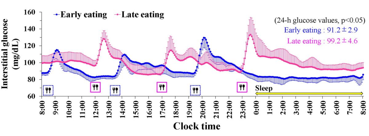 אף שנדרשים מחקרים נוספים, בשנים האחרונות מצטברות עדויות משמעותיות ליתרונות קרדיו-מטבוליים בצריכת מזון מוקדמת יותר ביום. נראה כי אכילה בשעות מאוחרות עלולה להוביל לעלייה בעמידות לאינסולין ובאי סבילות לגלוקוז ככל הנראה על רקע שיבוש של שעונים צירקדיים. בהתאם לכך, נראה כי אין הצדקה מדעית להמלצה המסורתית על ארוחת לילה לתיקון רמות הסוכר בצום בבוקר. נהפוך הוא, ארוחה מאוחרת עלולה להחמיר את העמידות לאינסולין העומדת בבסיס תופעת השחר.